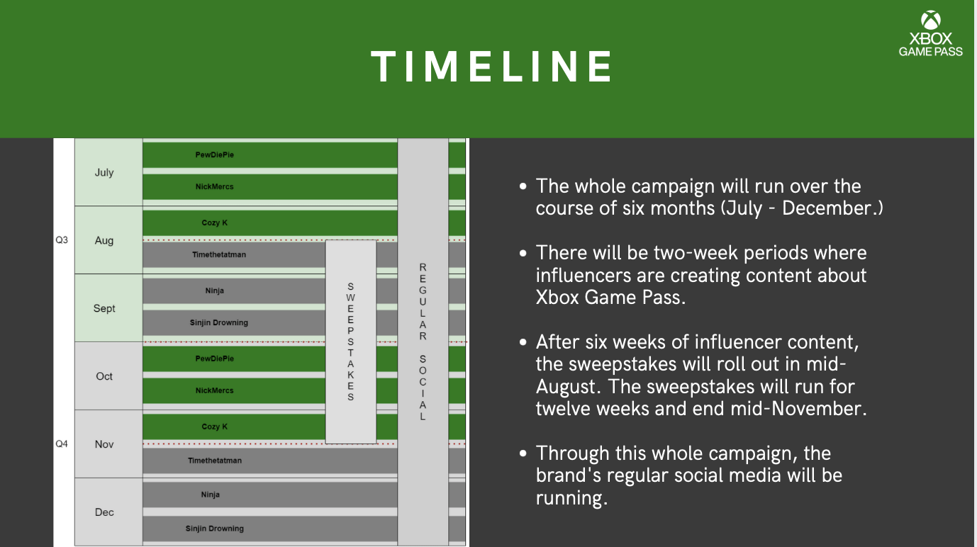 Our Strategy was to first create a partnership with Doritos and Pepsi Co. and promote a sweepstakes that offers the Xbox Game Pass. We also came up with a march madness style tournament with streamers and influencers to spread awareness.